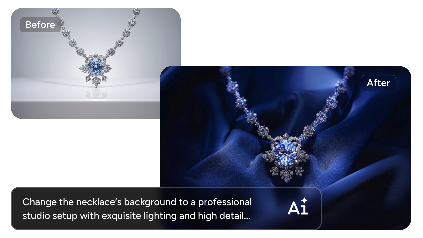 Describe the desired look of your jewelry image. Include details about lighting style, background type, mood, or scene. Clear and concise prompts guide the AI to produce professional, visually appealing results that match your branding and style preferences.