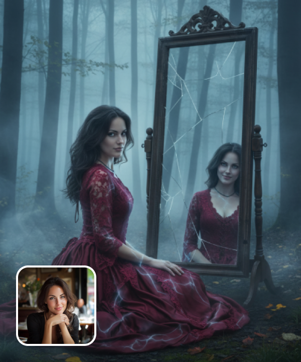 Hyper-realistic full-body portrait, a person (their exact face and hair preserved:1.5) sitting on the misty forest ground, facing a tall broken mirror. Thick fog surrounds the dark trees, with dim bluish light filtering through the mist. The person wears a deep red gothic dress with lace and torn silk details, faintly glowing under the cold light. Their reflection in the mirror subtly differs, showing an eerie expression and shadowed eyes. The atmosphere is quiet, cinematic, and unnervingly beautiful, with scattered leaves, wet grass, and drifting mist. Photorealistic supernatural horror aesthetic, soft volumetric lighting, 4k.