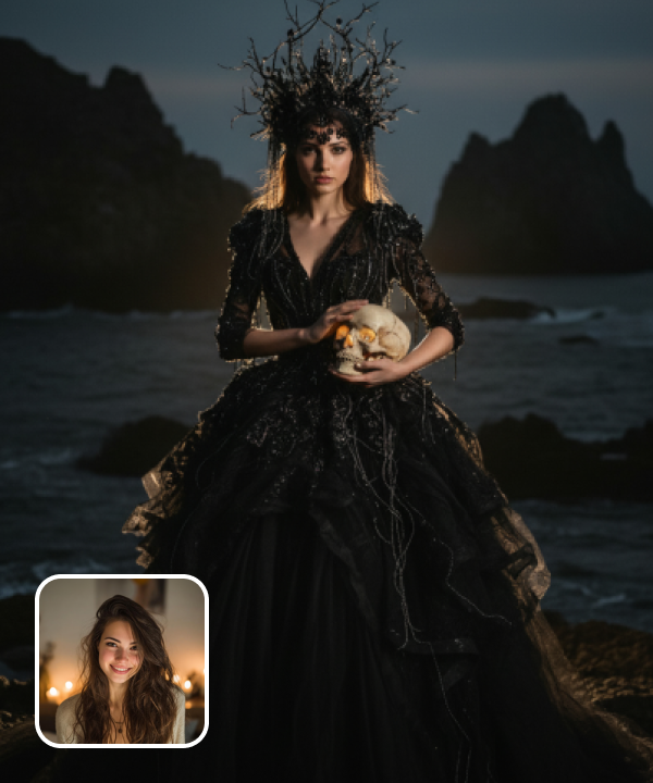 Strongly preserve the person’s real face, eyes, mouth, and facial structure.A model in a black wedding dress, adorned with gorgeous accessories on her head. She stands by the seaside, holding a skull that emits a faint golden glow in her arms. In the background, with backlighting and edge light illuminating the scene, shrouded in darkness. This is a fashion photography piece in the style of John Galliano, shot on Kodak Portra 400 film. 4k, hyper-detailed, capturing the dress and scene from head to toe.