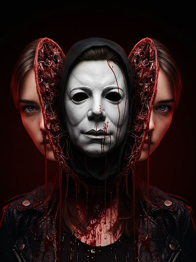 Facial features of the reference image are fully preserved. The person's neck and shoulders are visible and intact, but the head is perfectly and violently split open along the sagittal plane (midline), no mask, the left and right halves of a beautiful human face with blue eyes slightly separated and symmetrically mirrored. In the resulting chasm, the full iconic Michael Myers mask emerges and pushes out, with its featureless white face and dark, ominous eyes. Black hood fabric spills from the brain cavity, and blood drips heavily. Hyper-realistic gore horror, cinematic crimson backlighting, dark void background, ultra-detailed exposed skull and veins, photorealistic, 4k.