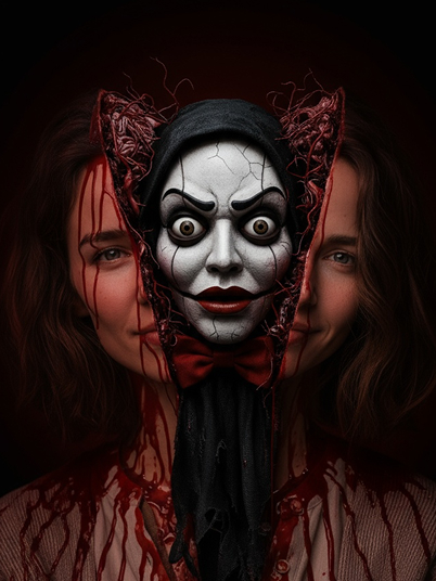 Facial features of the reference image are fully preserved. The person's neck and shoulders are visible and intact, but the head is perfectly and violently split open along the sagittal plane (midline), no mask, the left and right halves of a beautiful human face with blue eyes slightly separated and symmetrically mirrored. In the resulting chasm, the full iconic Billy the Puppet (from Dead Silence) emerges and pushes out, with his pale white face, red bow tie, prominent red lips, and dark, unsettling eyes. Black hood fabric spills from the brain cavity, and blood drips heavily. Hyper-realistic gore horror, cinematic crimson backlighting, dark void background, ultra-detailed exposed skull and veins, photorealistic, 4k.