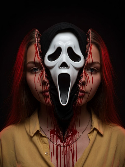 A dark, cinematic horror scene unfolds in a small bathroom. A young woman stood confidently in front of the mirror. She held a red lipstick in one hand, and the mirror was covered with kisses smeared with red lipstick and big "Are you scared?" In the reflection behind her, a ghost-faced assassin from "Scream" wore his signature mask, a dark robe, and held a knife in his hand, staring at her silently. The atmosphere was tense and strange, with dramatic lighting highlighting the woman's expressions and the unsettling presence of the characters. Style keywords: film, horror, thriller, dark atmosphere, surrealism, grotesque, suspense. No tattoos.