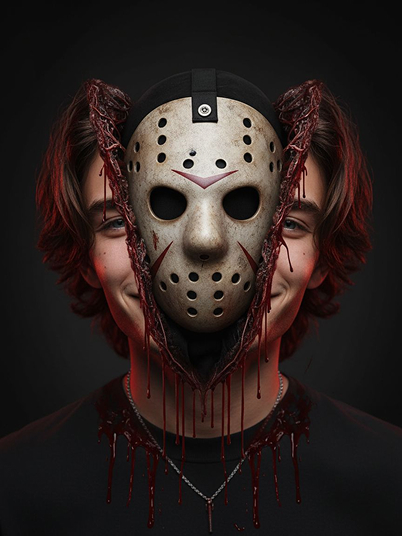 Facial features of the reference image are fully preserved. The person's neck and shoulders are visible and intact, but the head is perfectly and violently split open along the sagittal plane (midline), no mask, the left and right halves of a beautiful human face with blue eyes slightly separated and symmetrically mirrored. In the resulting chasm, the full iconic Jason Voorhees' hockey mask emerges and pushes out, with its dirty white, battle-worn appearance and menacing eye holes. Black hood fabric spills from the brain cavity, and blood drips heavily. Hyper-realistic gore horror, cinematic crimson backlighting, dark void background, ultra-detailed exposed skull and veins, photorealistic, 4k.